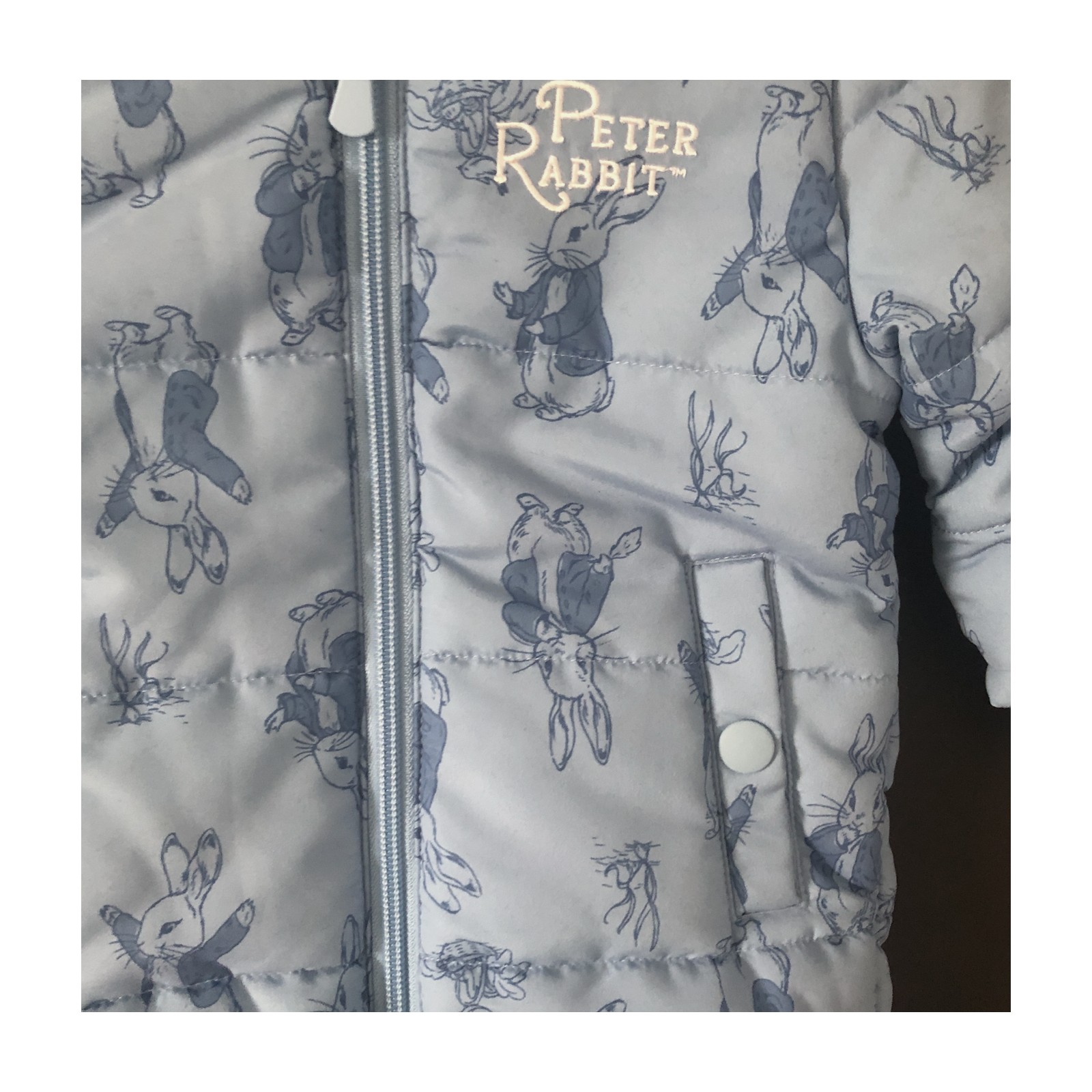 The hooded snowsuit features a full zip closure and the adorable Peter Rabbit character, making it ideal for outdoor activities.