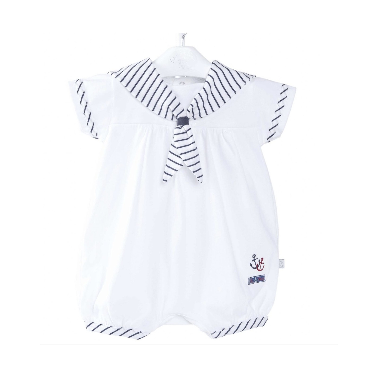 Short Sleeves: Designed for warm weather, this romper features short sleeves that keep your baby cool and comfortable. The crisp white fabric is accented with navy details, adding a touch of sophistication to the ensemble.