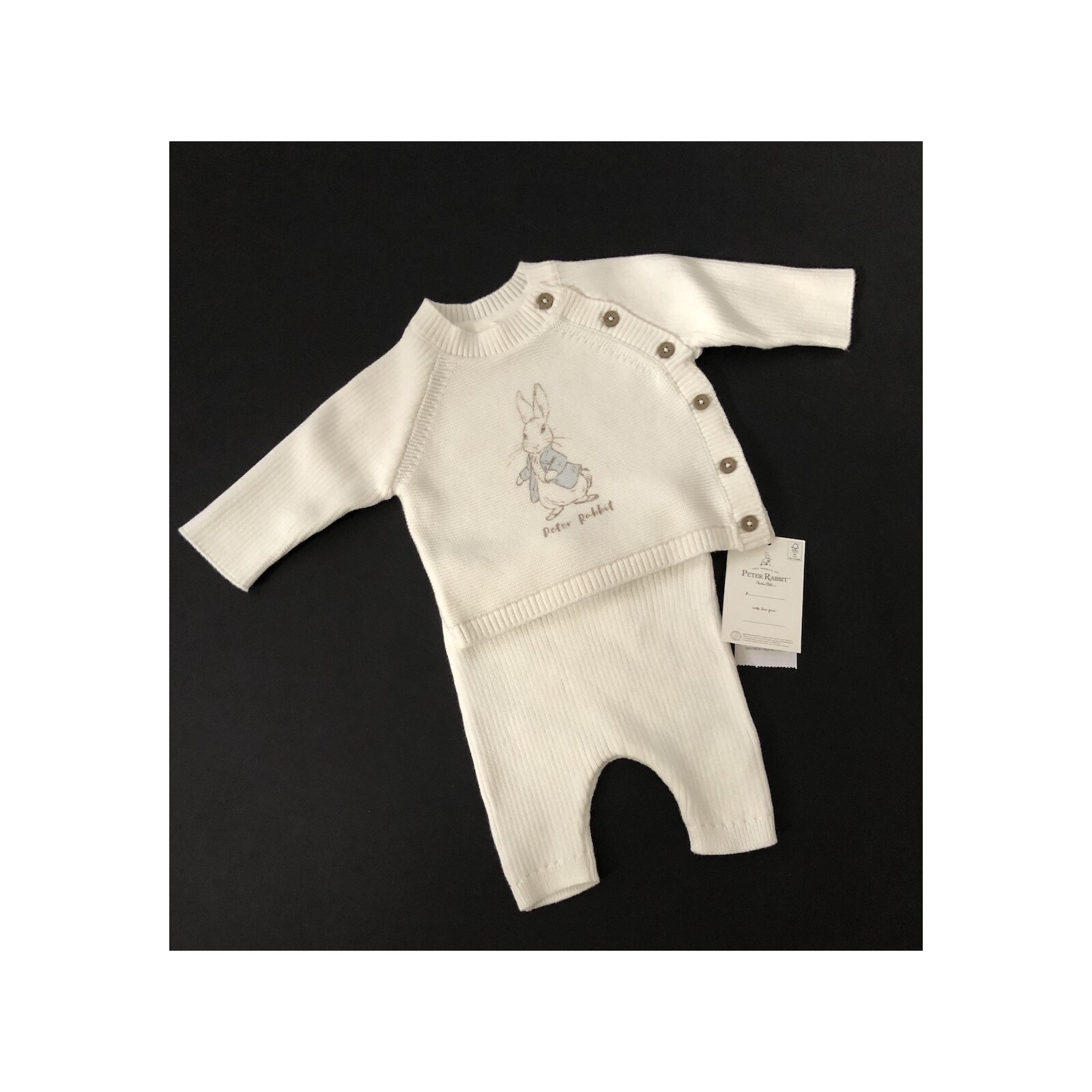 This Peter Rabbit knitted cream top and trousers set is a stylish choice for baby boys.