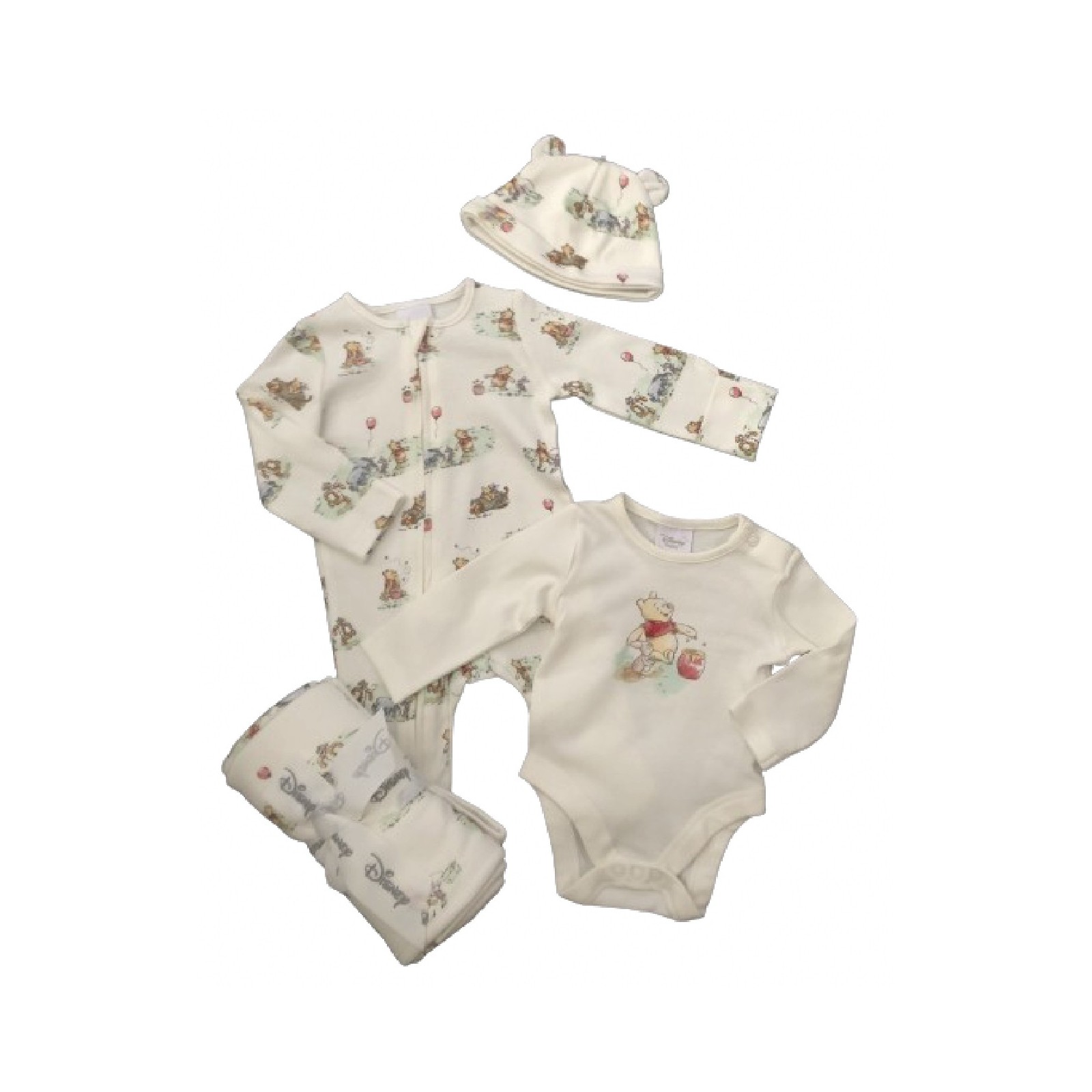 Create precious memories with the Winnie the Pooh 4-Piece Set, a perfect combination of comfort and classic style. Ideal for gifting or as a cherished addition to your baby's wardrobe, this set is sure to bring joy and coziness to your little one's early days.