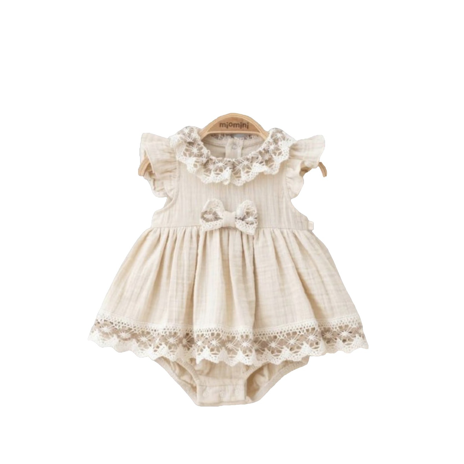 Dress up your little girl in this elegant beige muslin look dress set, perfect for any casual occasion!