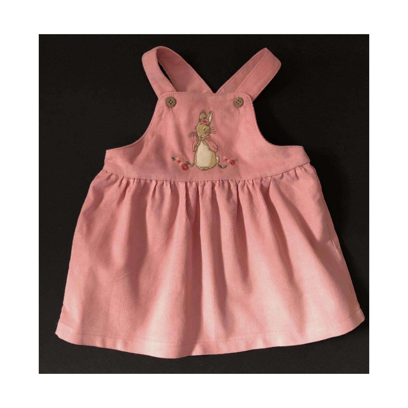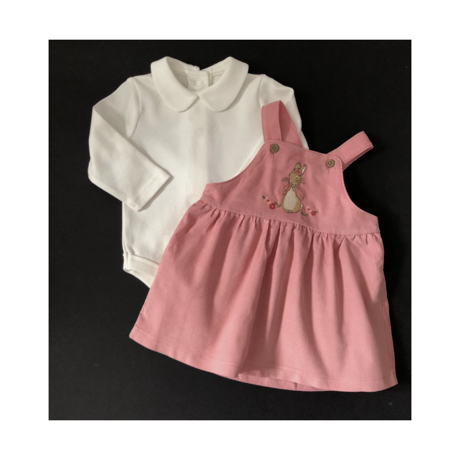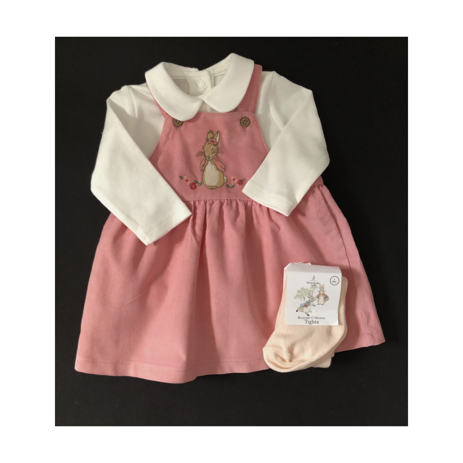 This cute Baby Girls Peter Rabbit Dress Top and Tights set features a floral pattern in pink corduroy material, perfect for baby's first outfit.