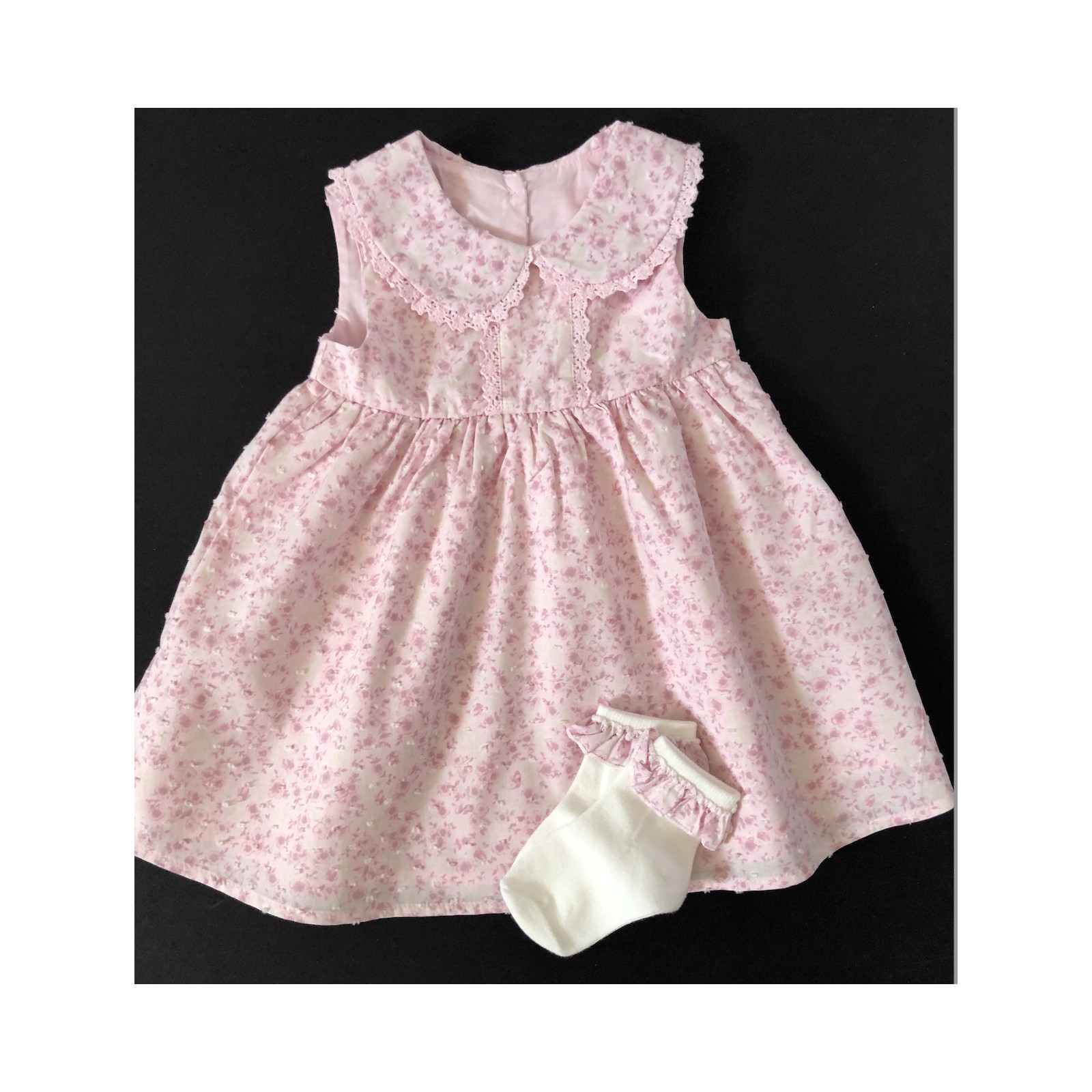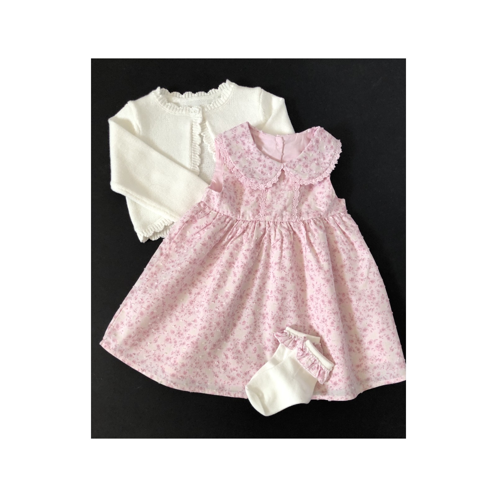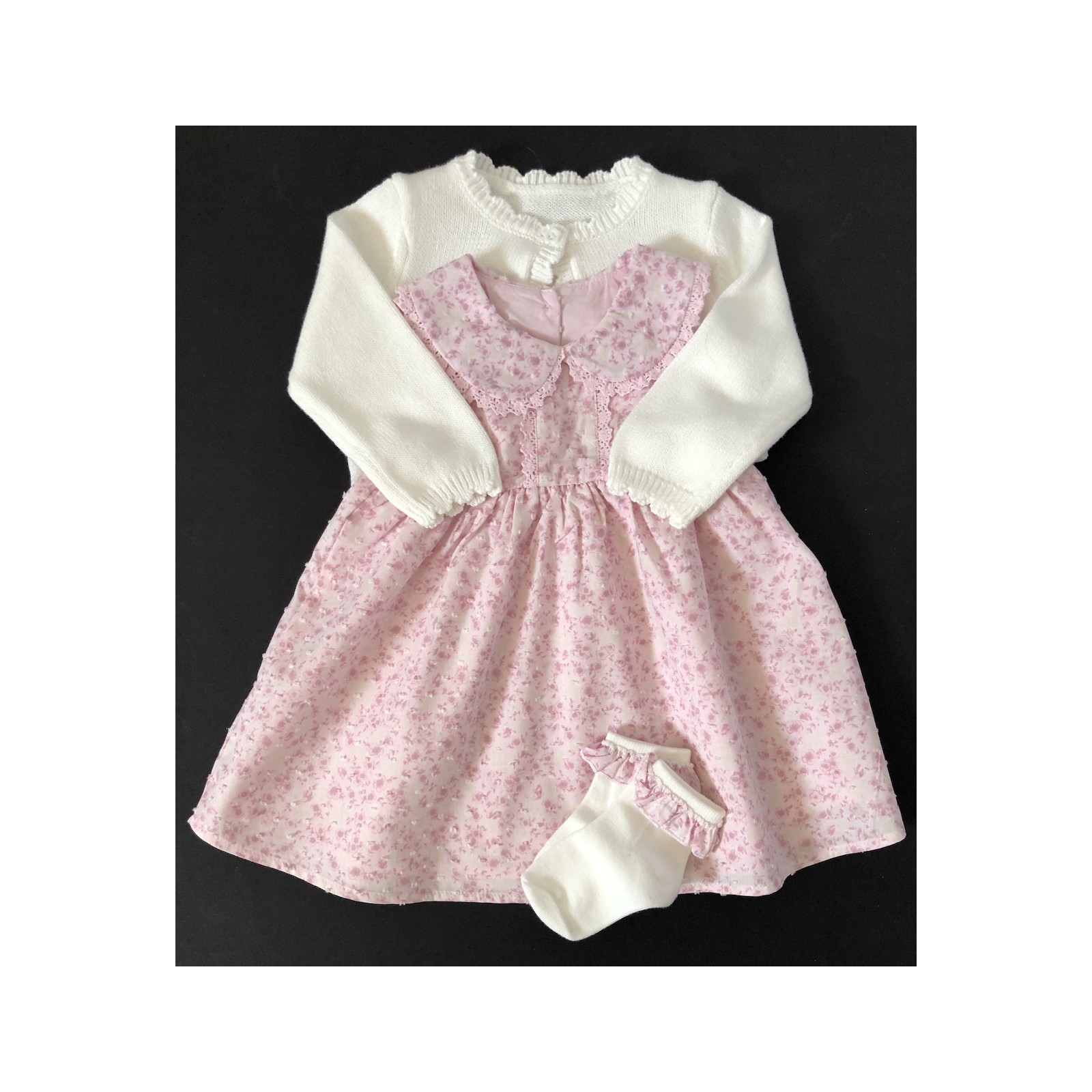 Dress your baby girl in a charming pink and white knee-length dress with a matching cardigan and socks.