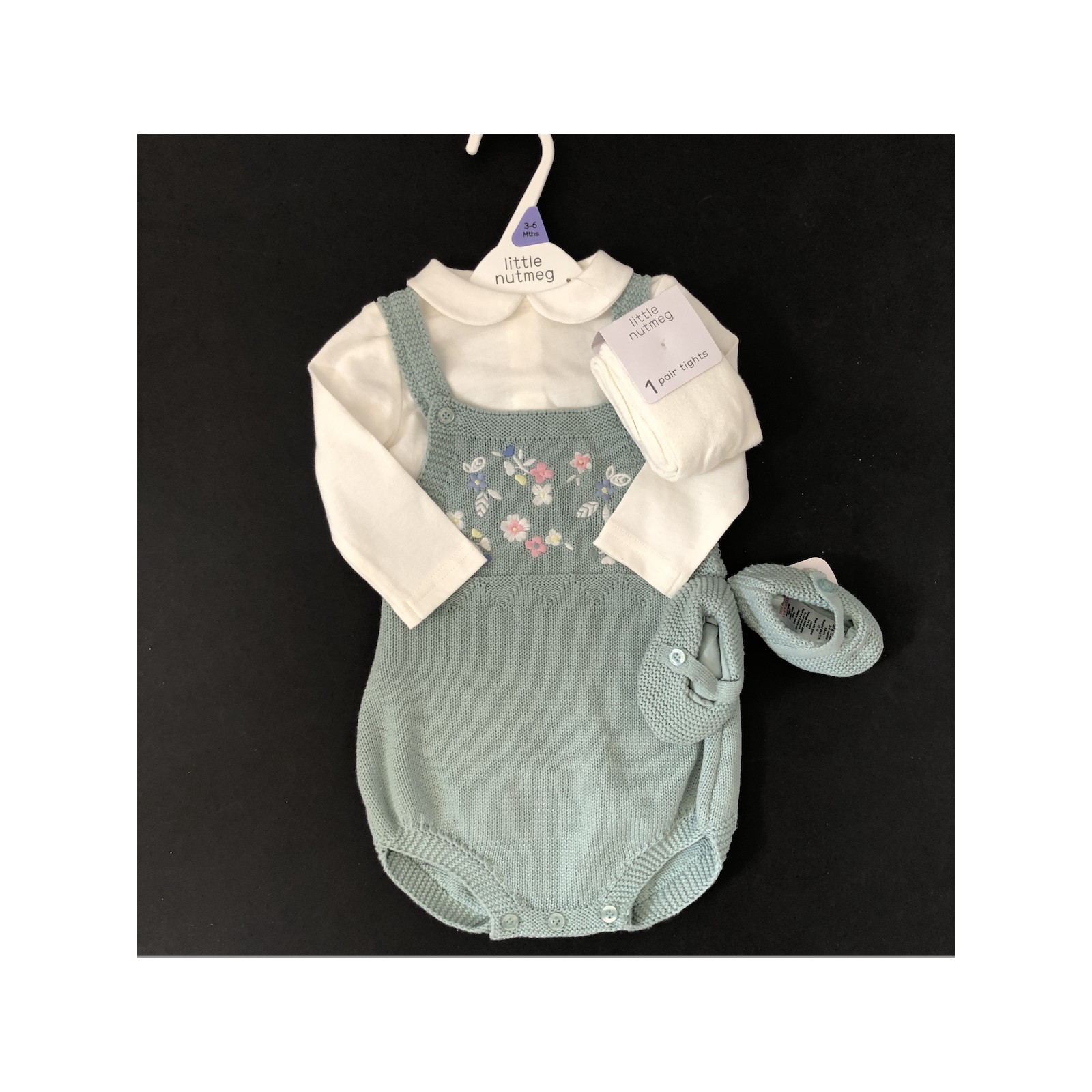 The outfit includes a snug-fitting romper, matching tights, and adorable shoes, ensuring a cohesive and cute look for any occasion.