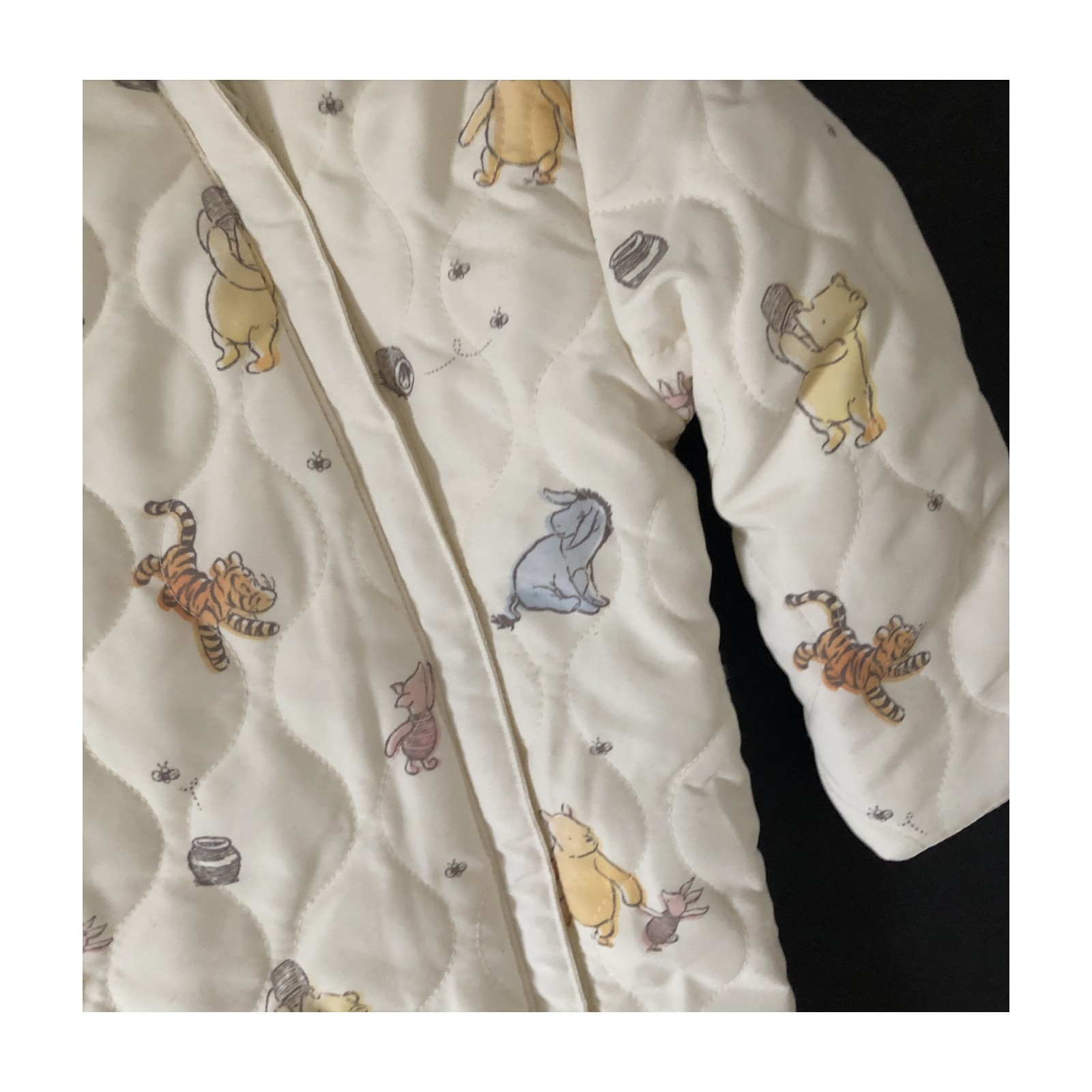 This unisex padded Winnie the Pooh snowsuit pram suit features a charming design with a beige colour and a hooded style.